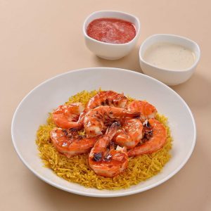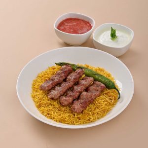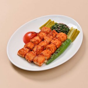 A platter of 10 skewers of tender grilled lamb tikka, accompanied by BBQ onions, BBQ tomatoes, and pickles.