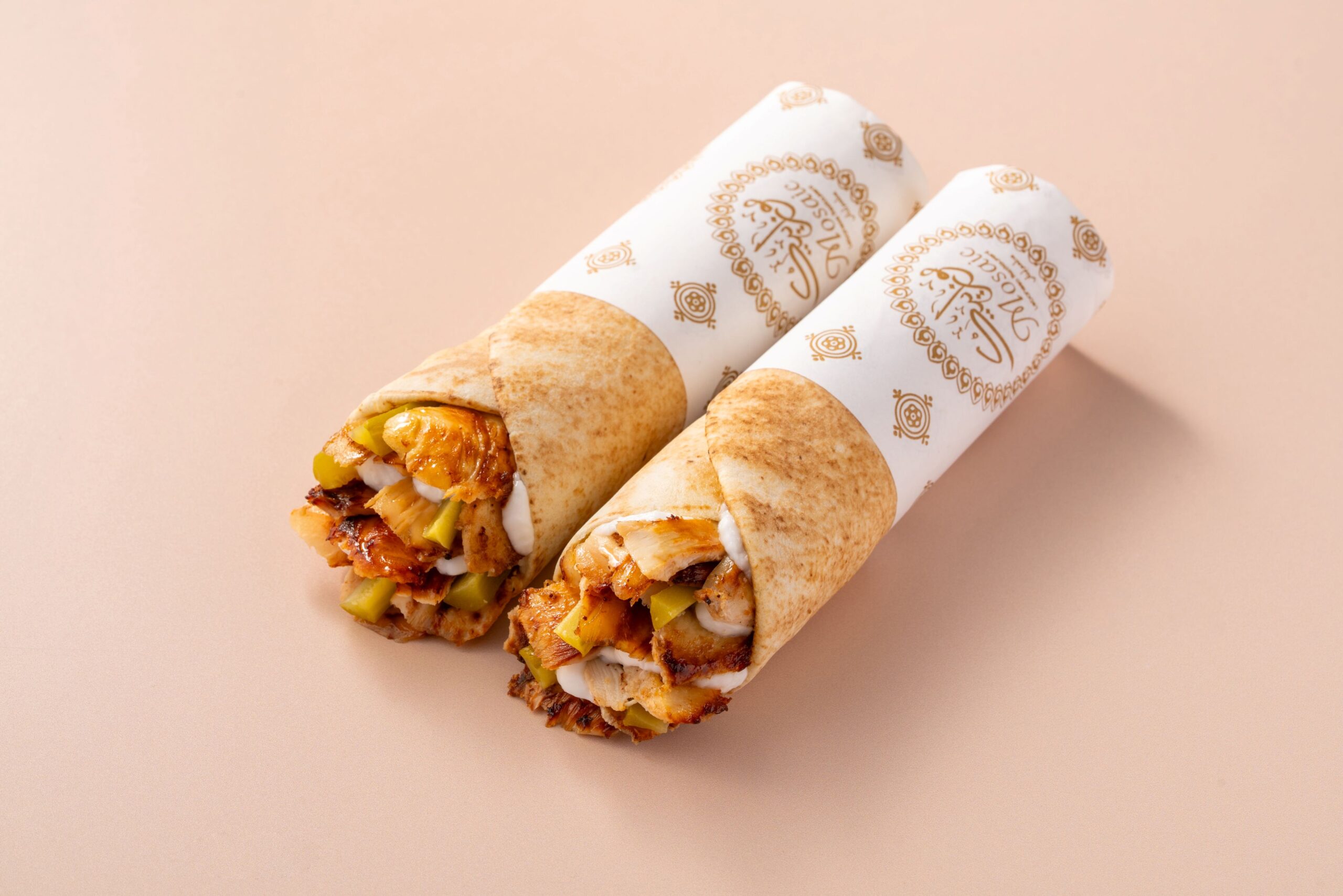 Two juicy chicken shawarma sandwiches with rich garlic paste and crisp pickles.