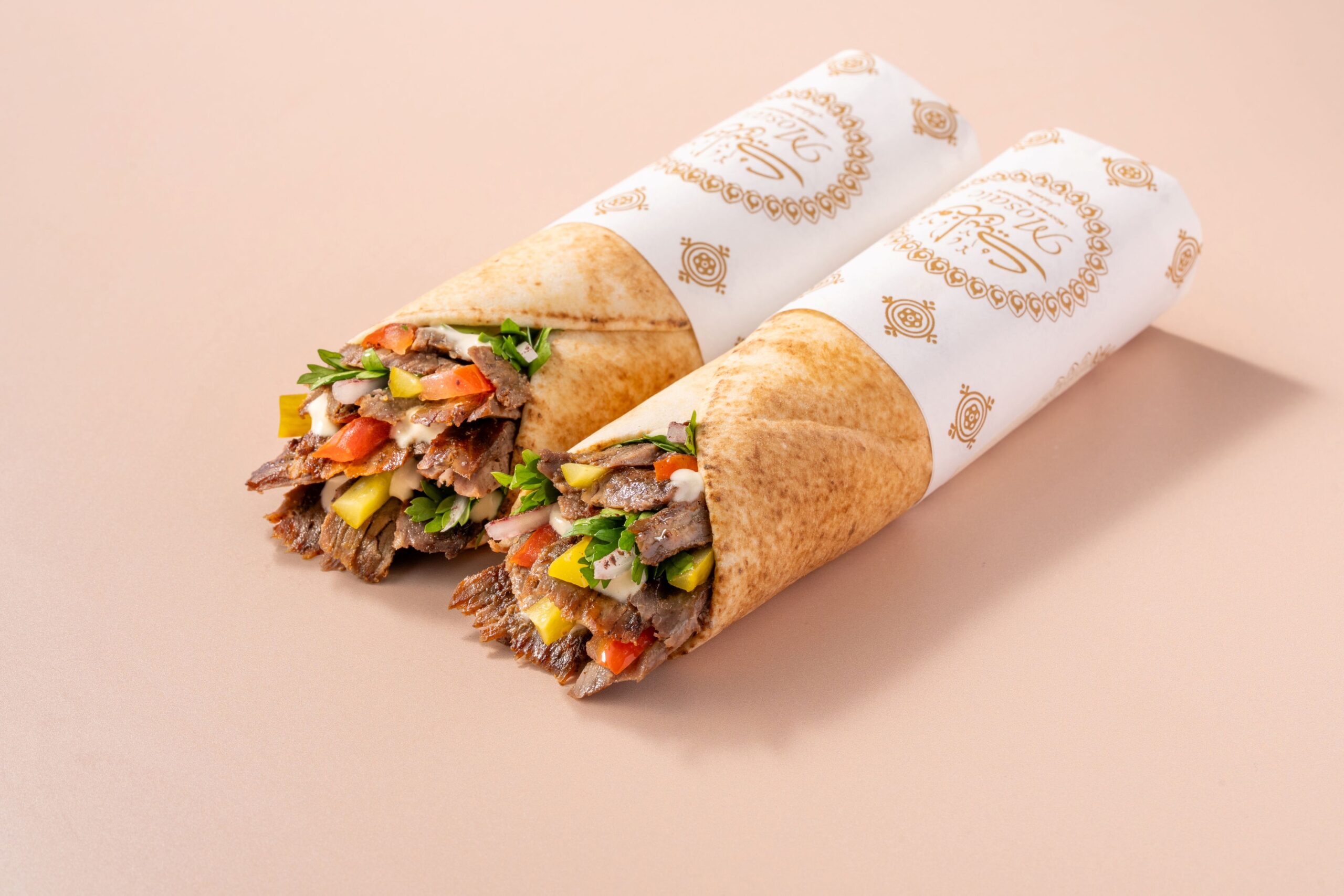 Two traditional Lebanese meat shawarma sandwiches with tomato, pickles, onions, fresh parsley, and tahini sauce.
