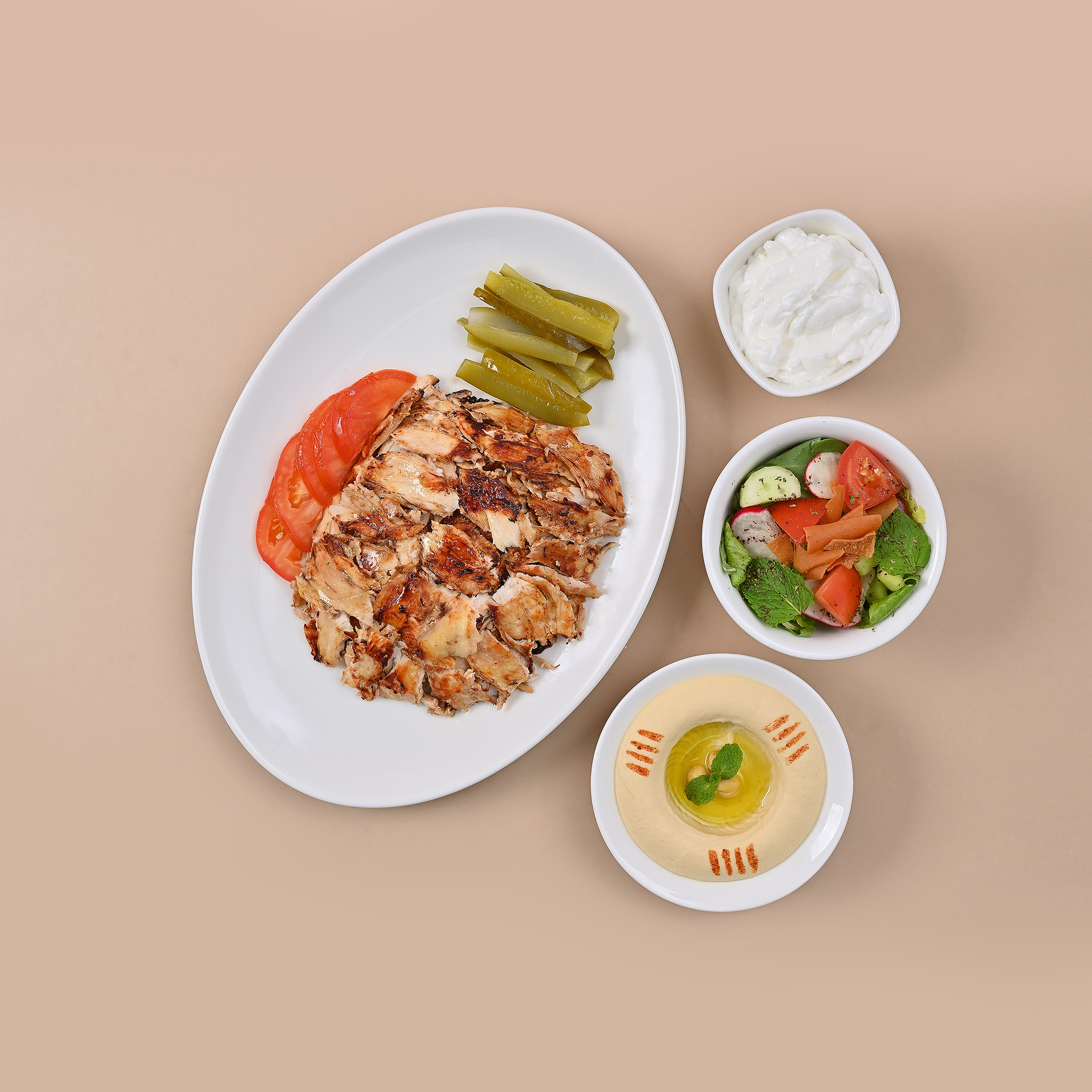 Tender chicken shawarma plate served with golden fries, small hommos, fresh fattoush, and garlic paste.