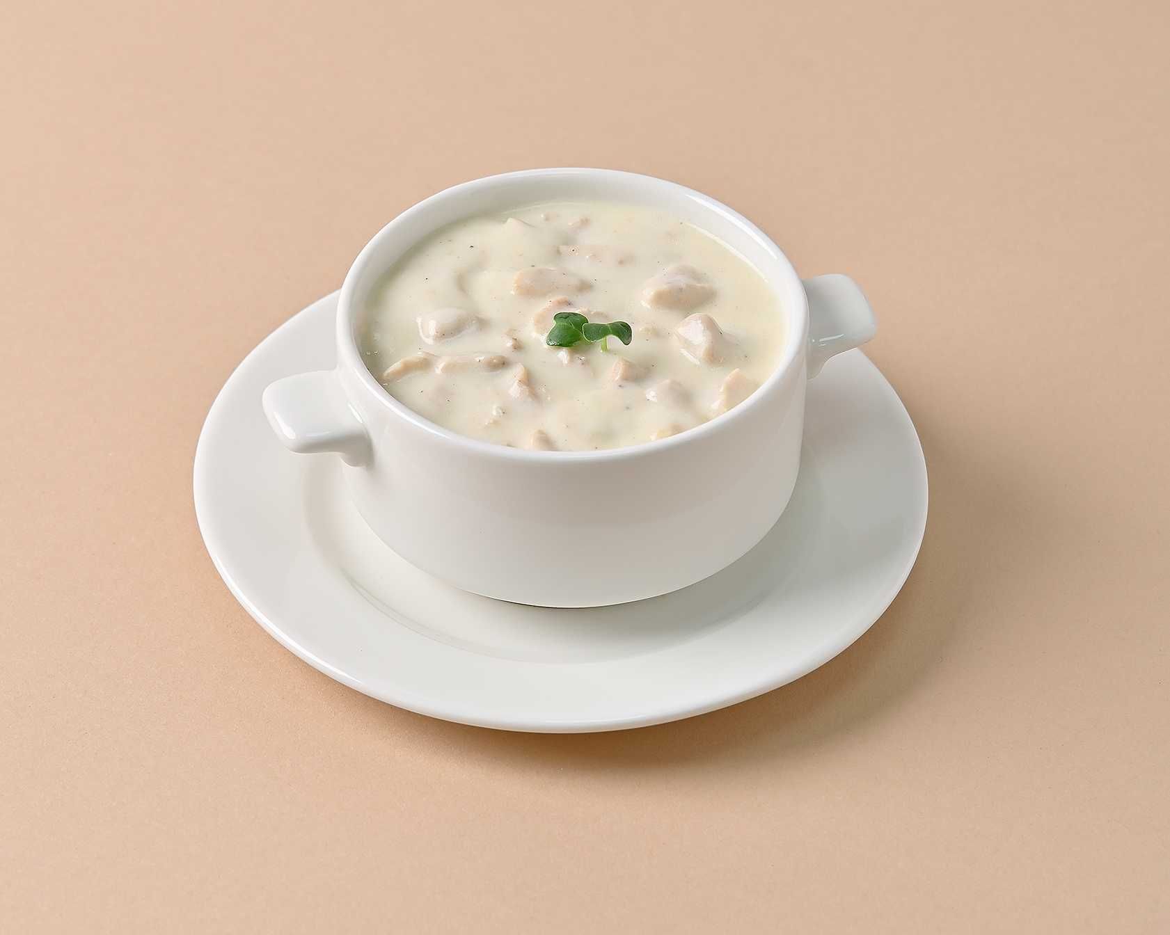 Tender chicken pieces simmered in a rich, creamy broth made with fresh cream and delicate seasoning.