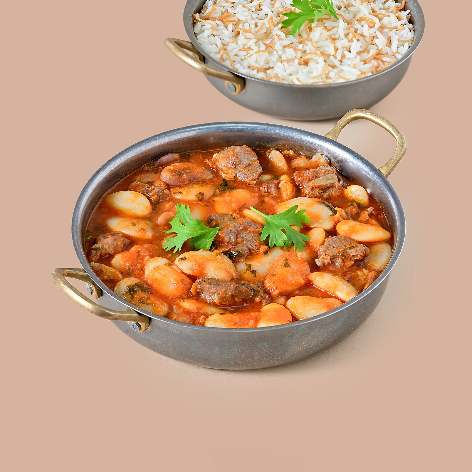 Tender meat pieces cooked with white beans in a rich tomato sauce, served with fluffy vermicelli rice.
