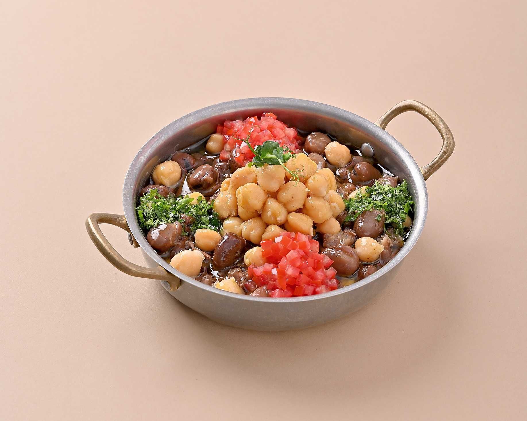 Fava beans and chickpeas seasoned with lemon and garlic.