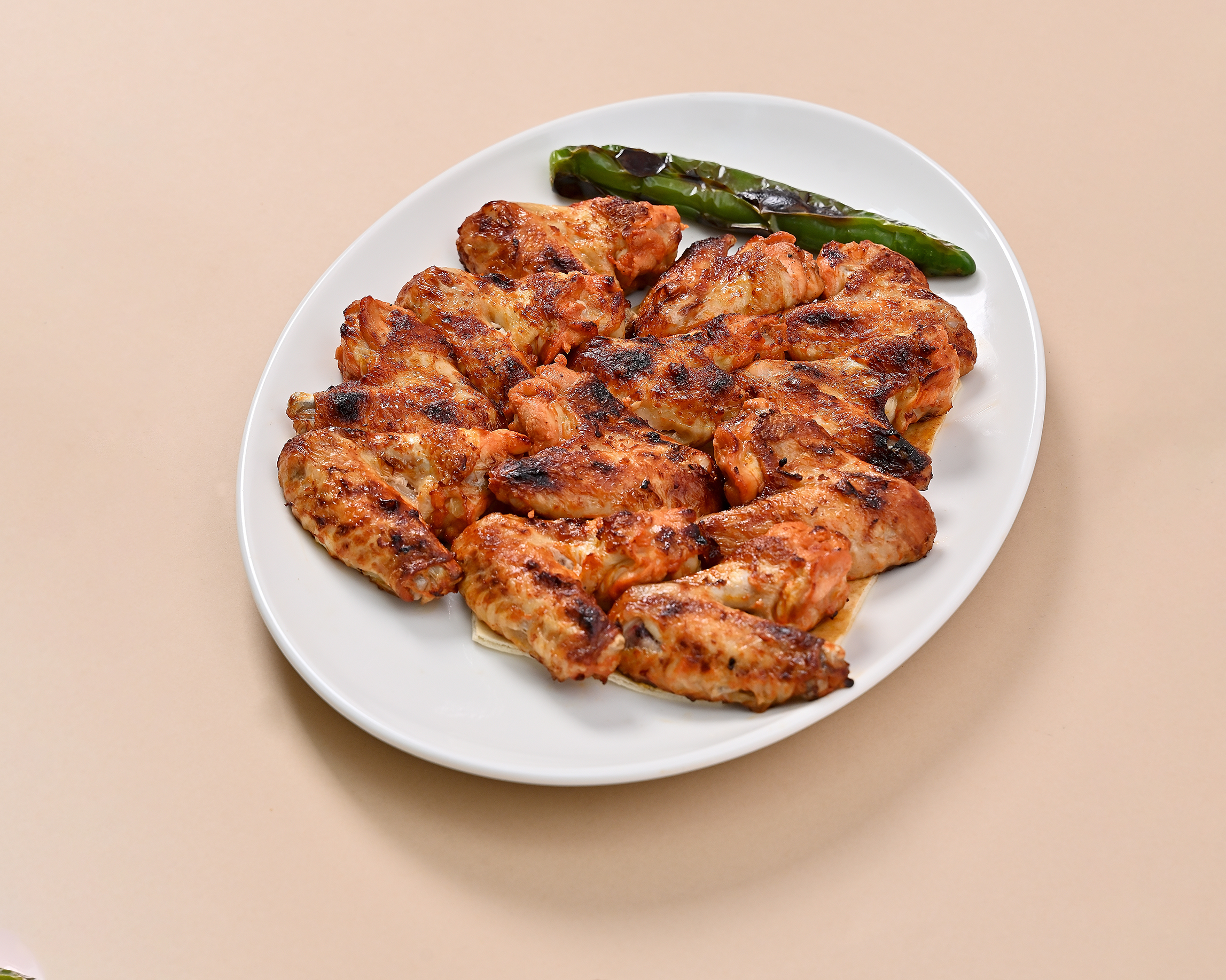 Twelve pieces of grilled chicken wings served with garlic paste and pickles.