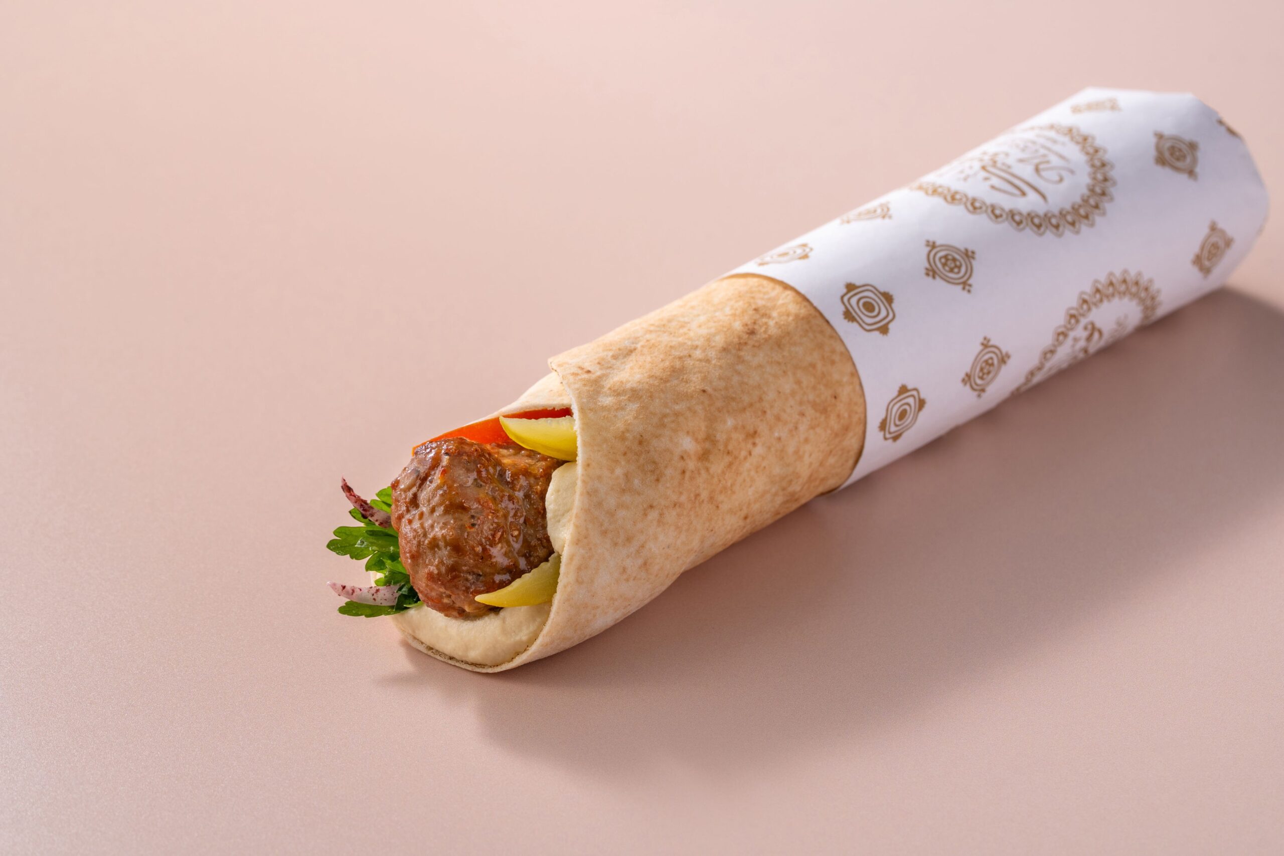 Spicy kabab with hummus, parsley, tomatoes, and pickles.