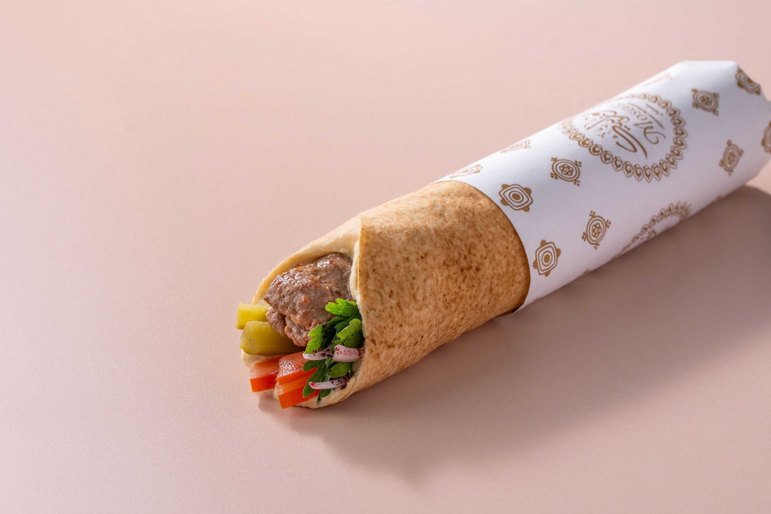 Classic meat kabab with hummus, fresh parsley, onions, tomatoes, and pickles.