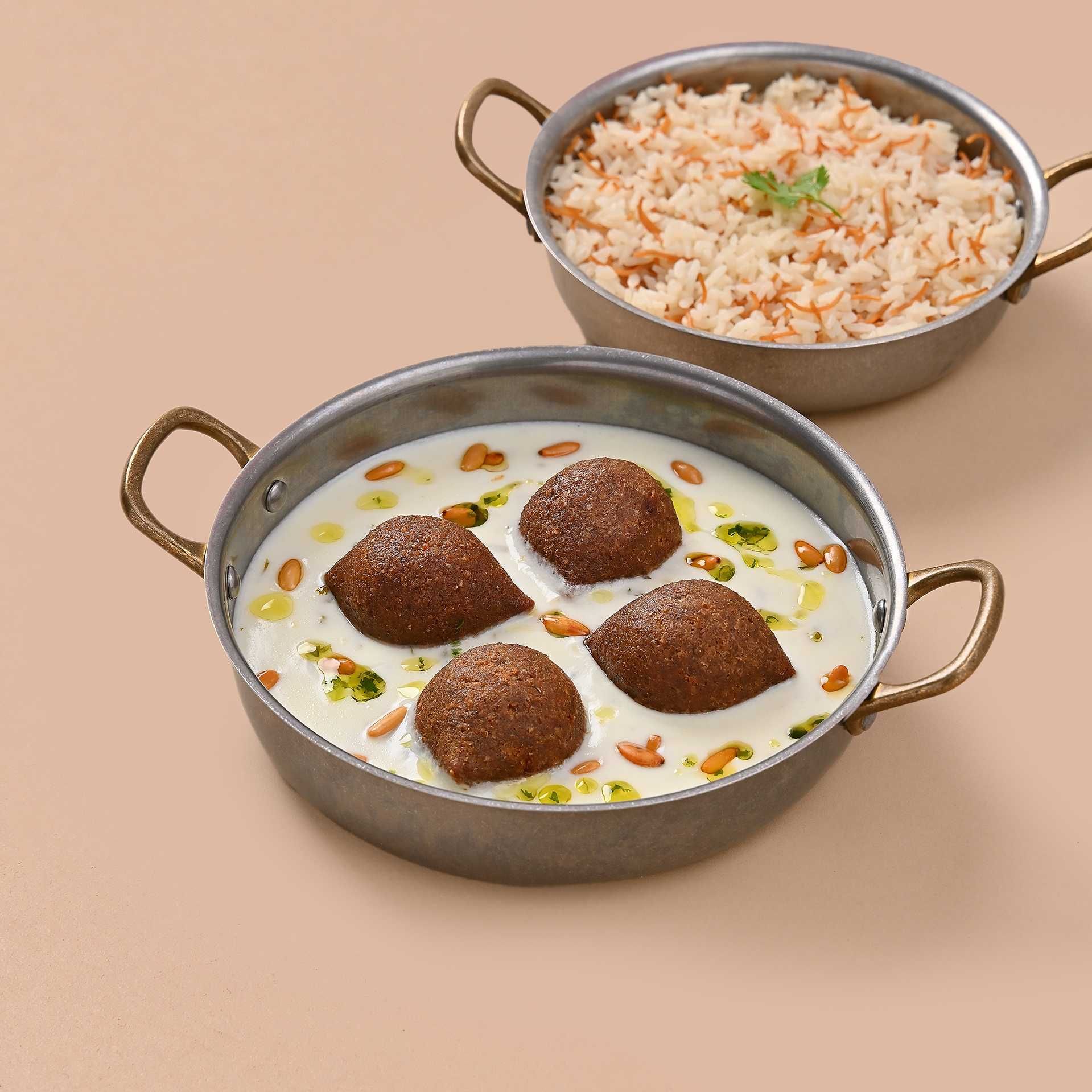 Tender kibbeh balls simmered in warm yogurt sauce with garlic, served with fluffy vermicelli rice.