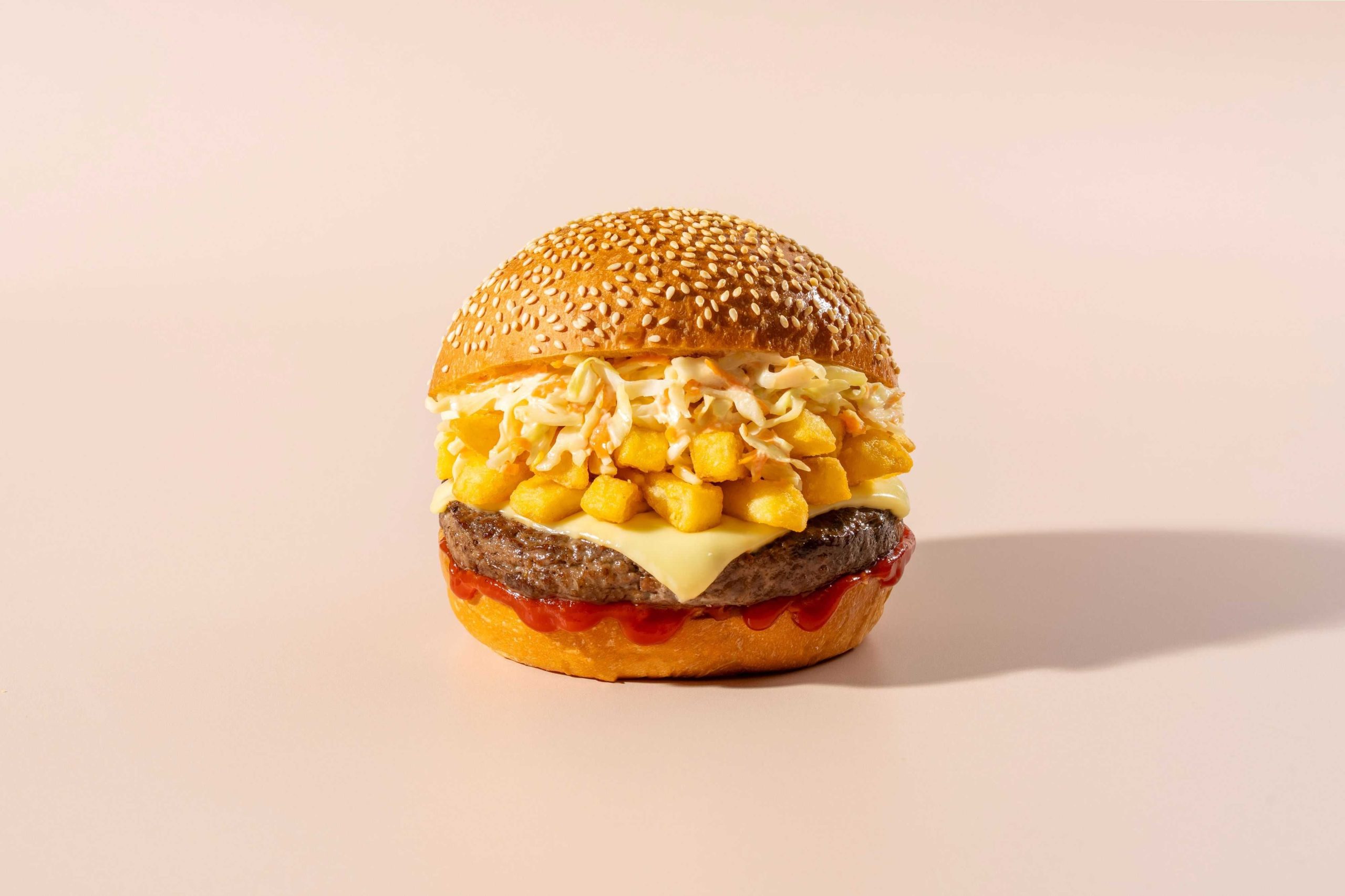 Classic Lebanese style beef burger with melted cheese, served with crispy French fries, tangy ketchup, and creamy coleslaw.