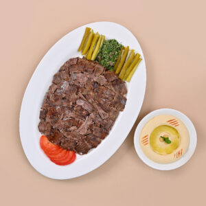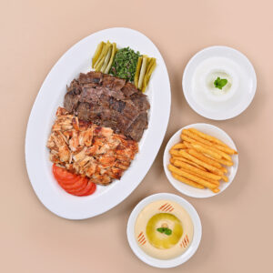 Meat shawarma wrapped in warm saj bread, topped with tahini sauce, and served with golden French fries.